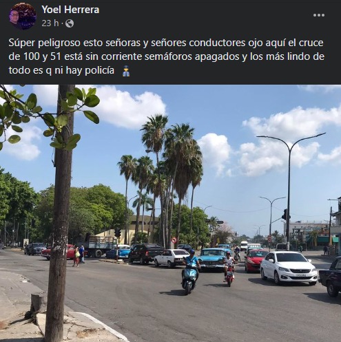 “Súper peligroso esto señoras y señores. Conductores, ojo aquí: El cruce de 100 y 51 está sin corriente. Semáforos apagados, y lo más lindo de todo es que ni hay policía”, alertó un cubano en el grupo Accidentes de Buses & Camiones.