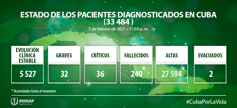 El Ministerio de Salud Pública de Cuba (MINSAP) reportó al cierre del 7 de febrero, 653 casos nuevos de COVID-19 para un total de 33 mil 484 contagios desde el inicio de la pandemia en marzo pasado.