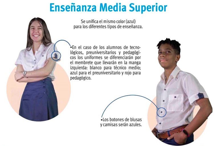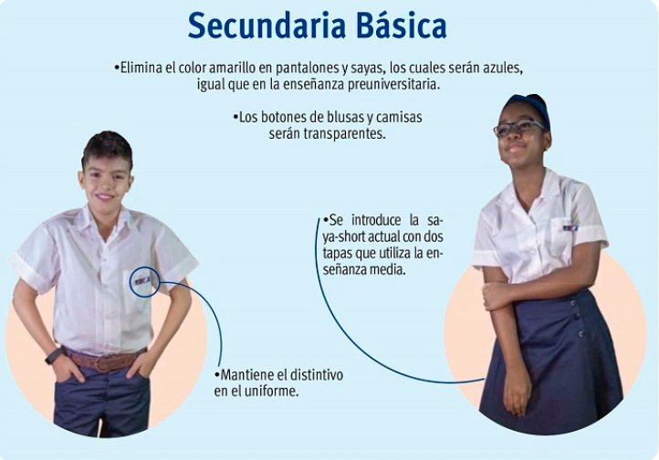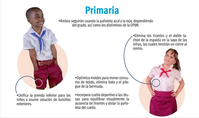 El uso de los nuevos modelos significa “un gran ahorro para las familias cubanas, además de que fomenta la igualdad, mantiene la disciplina escolar y estimula hábitos de cuidado de la apariencia personal”, asegura Rosa María Ramírez Montero, quien dirige la Organización de Pioneros José Martí (OPJM); y Hamlet Álvarez Aguiar, al frente de la Federación de Estudiantes de la Enseñanza Media (FEEM).
