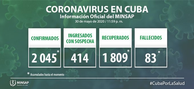 Actualmente, Cuba registra un total de 2.045 casos positivos y los decesos se mantienen en 82, luego de no registrarse ninguna muerte en los últimos días. Mientras tanto, permanecen ingresados bajo vigilancia clínica-epidemiológica 414 pacientes, 1.748 son monitoreados desde sus hogares por elementos de la Atención Primaria de Salud y 1.809 ya han recibido el alta médica (88,5%).