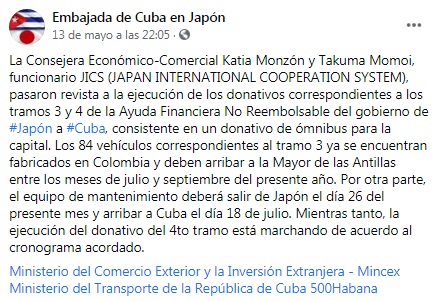 De acuerdo con la información publicada en la cuenta de Facebook de la Embajada cubana en Japón, el donativo tiene como objetivo mejorar la transportación pública de pasajeros.