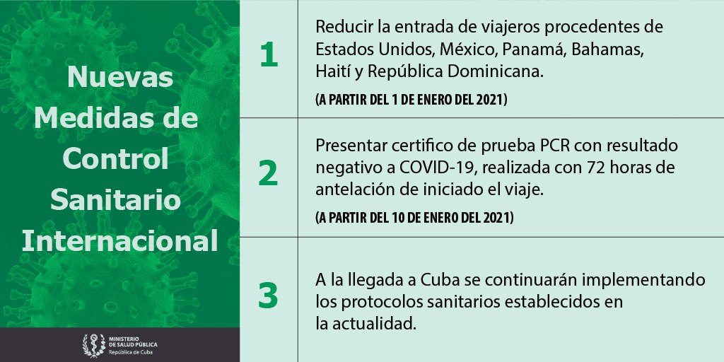 Como ya se había informado, Cuba estableció como requisito obligatorio para la entrada al país de todos los viajeros internacionales, la realización de una prueba PCR con resultado negativo a COVID-19, con 72 horas de antelación de iniciado el viaje. Esta medida entrará en vigor a partir del 10 de enero de 2021.