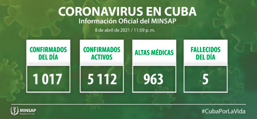 El Ministerio de Salud Pública de Cuba (MINSAP) reportó al cierre de este 8 de abril 1017 nuevos casos confirmados de Covid-19 para un total de 84 mil 532 contagios desde el inicio de la pandemia en marzo del año pasado.