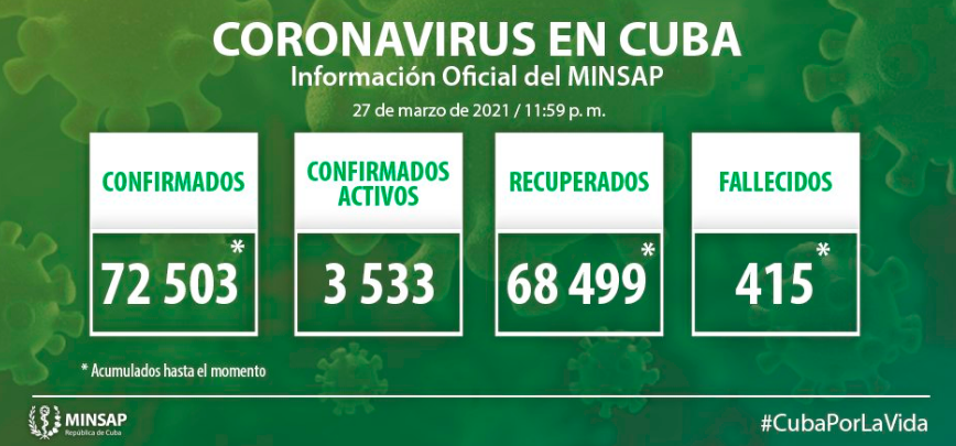 El Ministerio de Salud Pública de Cuba (MINSAP) reportó al cierre de este 27 de marzo 919 nuevos casos confirmados de Covid-19 para un total de 72 mil 533 contagios desde el inicio de la pandemia en marzo del año pasado.