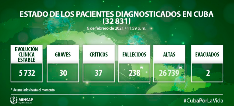 El Ministerio de Salud Pública de Cuba (MINSAP) reportó al cierre del 6 de febrero, 820 casos nuevos de COVID-19 para un total de 32 mil 831 contagios desde el inicio de la pandemia en marzo pasado.