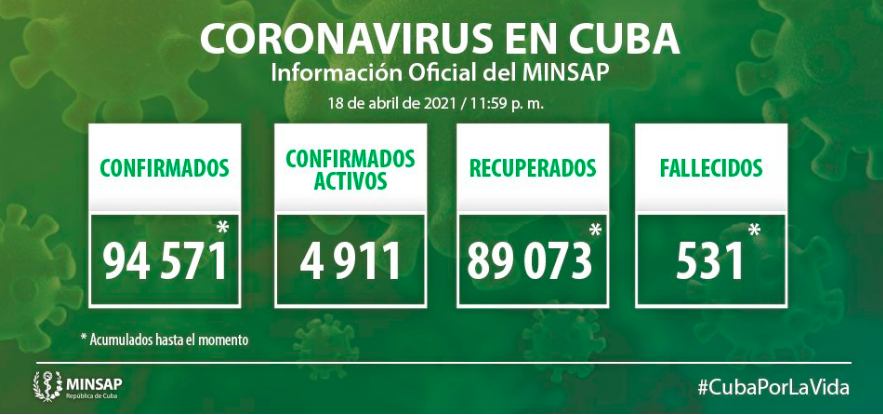 El Ministerio de Salud Pública de Cuba (MINSAP) reportó al cierre de este 18 de abril 1060 nuevos casos confirmados de Covid-19 para un total de 94 mil 571 contagios desde el inicio de la pandemia en marzo del año pasado.