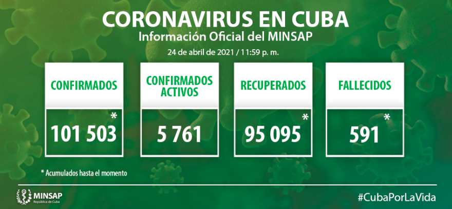 El Ministerio de Salud Pública de Cuba (MINSAP) reportó al cierre de este 24 de abril 1185 nuevos casos confirmados de Covid-19 para un total de 101 mil 503 contagios desde el inicio de la pandemia en marzo del año pasado.