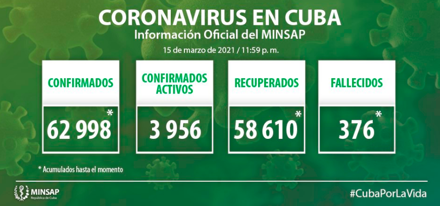 El Ministerio de Salud Pública de Cuba (MINSAP) reportó al cierre de este 15 de marzo 792 nuevos casos confirmados de Covid-19 para un total de 62 mil 998 contagios desde el inicio de la pandemia en marzo del año pasado.