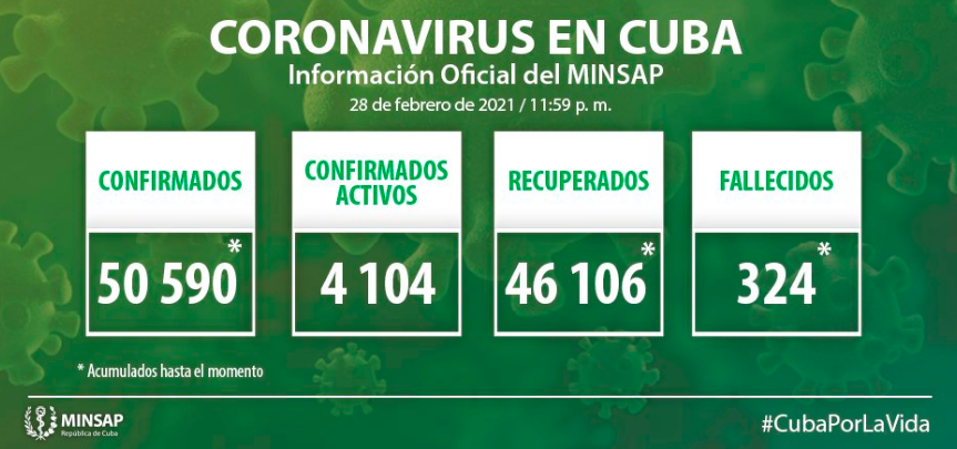 El Ministerio de Salud Pública de Cuba (MINSAP) reportó al cierre de este 28 de febrero 811 nuevos casos confirmados de Covid-19 para un total de 50 mil 590 contagios desde el inicio de la pandemia en marzo del año pasado.