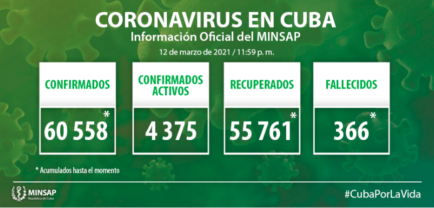El Ministerio de Salud Pública de Cuba (MINSAP) reportó al cierre de este 12 de marzo 639 nuevos casos confirmados de Covid-19 para un total de 60 mil 558 contagios desde el inicio de la pandemia en marzo del año pasado.