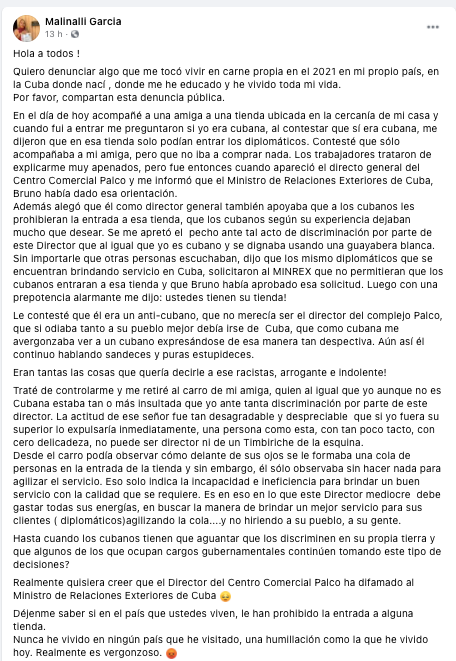 A las redes sociales llega la denuncia de una cubana que fue expulsada del Centro Comercial Palco por no ser diplomática o extranjera.