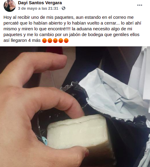 “Hoy al recibir uno de mis paquetes, aun estando en el correo me percaté que lo habían abierto y lo habían vuelto a cerrar… ¡Lo abrí ahí mismo y miren lo que encontré!!!! La aduana necesitó algo de mis paquetes y me lo cambió por un jabón de bodega, qué gentiles ellos, así llegaron 4 más”, se lee en la publicación de Santos Vergara.