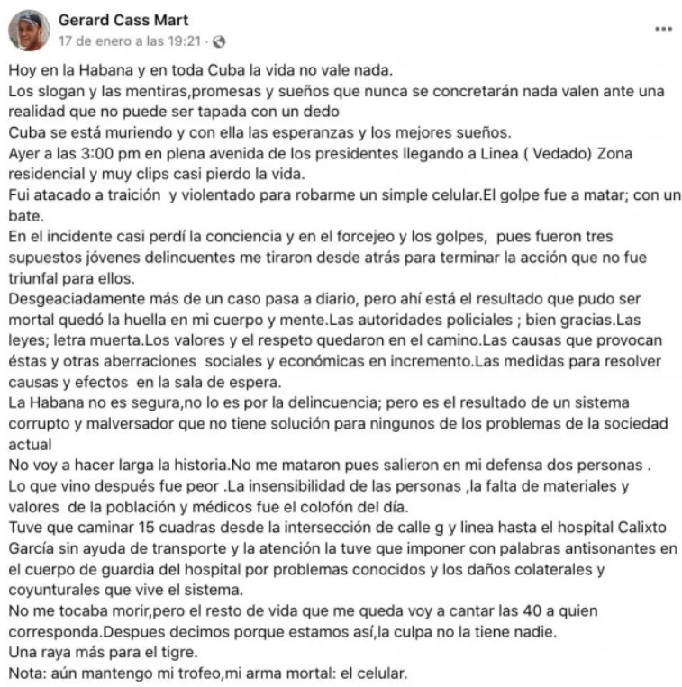 Además de señalar la evidente ola de crímenes que se han registrado durante los últimos meses en la Isla, el usuario también criticó al Sistema de Salud cubano, pues tuvo que pasar muchas penas antes de ser atendido debido a la situación coyuntural que azota los centros médicos del país desde hace tiempo.