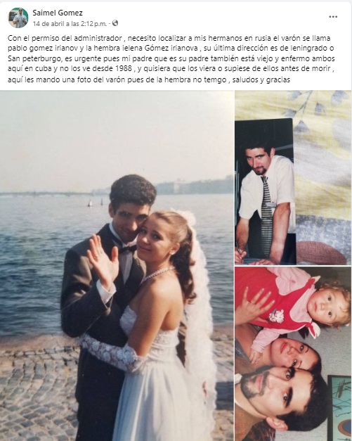 “Necesito localizar a mis hermanos en Rusia. El varón se llama Pablo Gómez Irianov, y la hembra Ielena Gómez Irianova, su última dirección es de Leningrado o San Petersburgo”, inicia el post.
