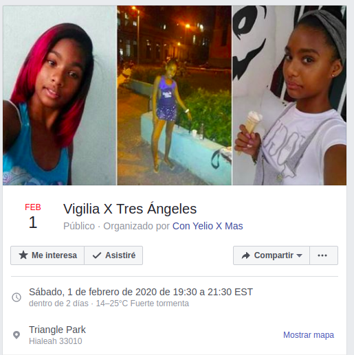 “En muestra de apoyo y solidaridad tras el trágico suceso del pasado lunes en la tarde en La Habana, donde perdieron la vida tres niñas inocentes: María Carla Fuentes (12) Lisnavy Valdés Rodriguez (12) y Roció García Nápoles (11) Cubanos en el exilio convocan a una Vigilia de Velas este Sábado a partir de las 7:30pm frente al Monumento a Laura Pollán en el Triangle Park en la Ciudad de Hialeah”, anunció el activista del exilio cubano.