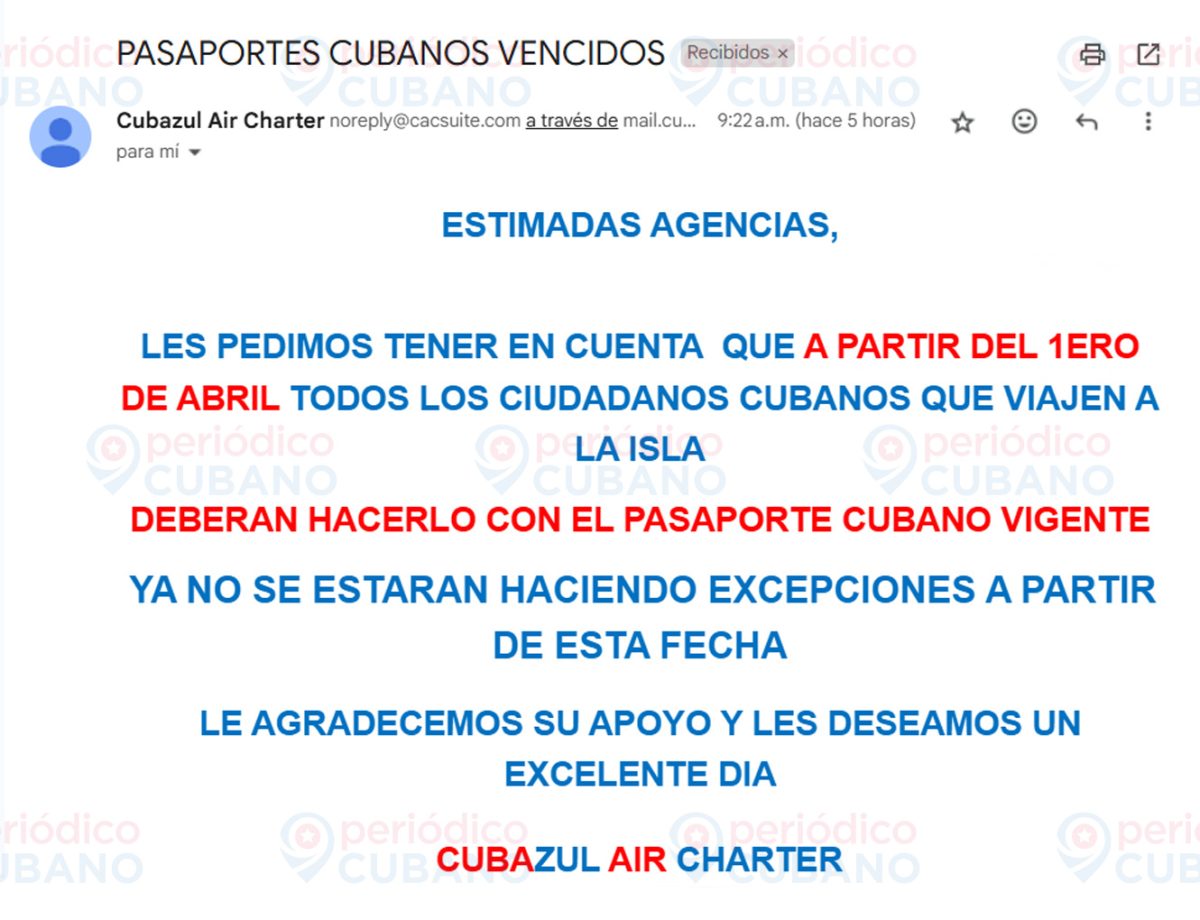 “Estimadas agencias, les pedimos tener en cuenta que, a partir del 1ero de abril, todos los ciudadanos cubanos que viajen a la Isla deberán hacerlo con el pasaporte cubano vigente. Ya no se estarán haciendo excepciones a partir de esta fecha. Les agradecemos su apoyo y les deseamos un excelente día, Cubazul Air Charter”, indicó el comunicado compartido por correo electrónico a varias agencias de viaje.