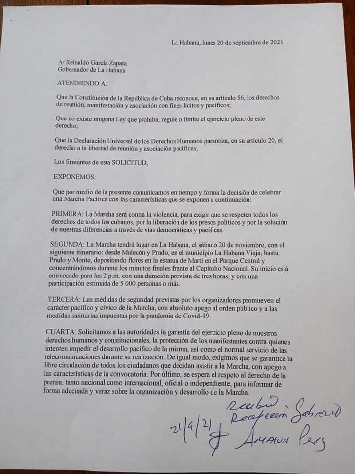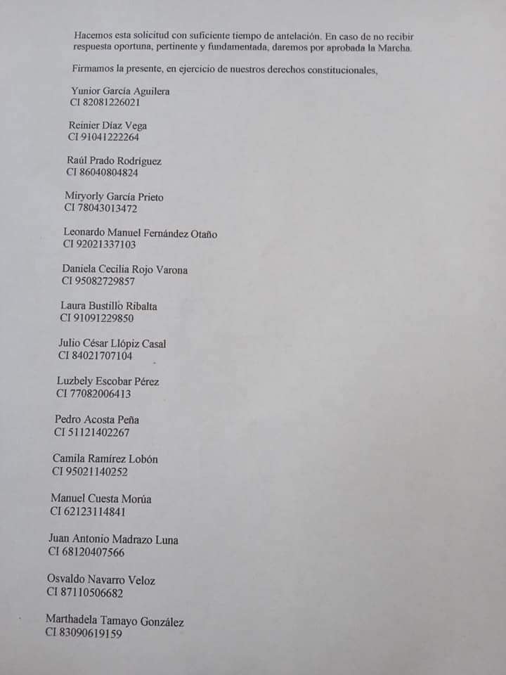 La solicitud presentada a las autoridades habaneras este martes fue firmada por el cineasta Raúl Prado Rodríguez, el actor Reinier Díaz Vega y la editora Miryorly García Prieto, entre otros artistas e intelectuales que participaron en las protestas históricas del pasado 11 de julio
