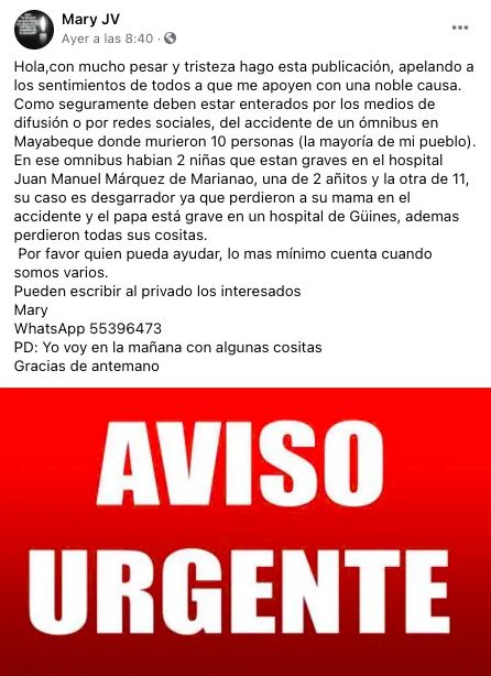 A las redes sociales llega una petición de ayuda para las niñas que sobrevivieron al fatal accidente en el puente Güines de Mayabeque, donde 10 personas murieron y 24 resultaron heridas.