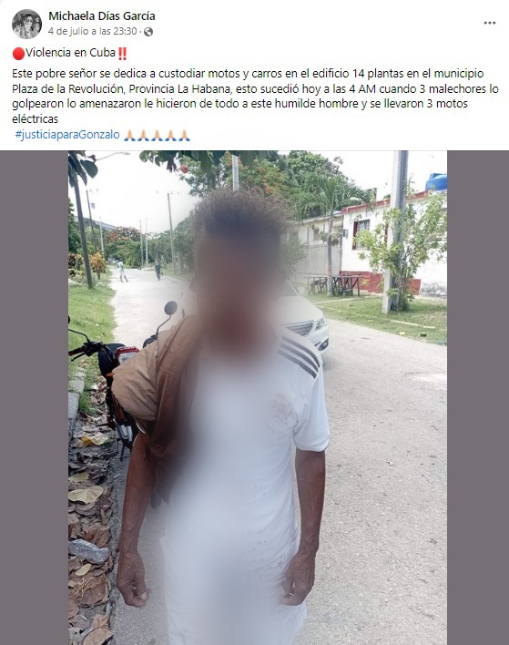 “Este pobre señor se dedica a custodiar motos y carros en el edificio 14 plantas, en el municipio Plaza de la Revolución, provincia La Habana”, publicó la internauta Michaela Días García, quien también compartió una fotografía de la víctima.