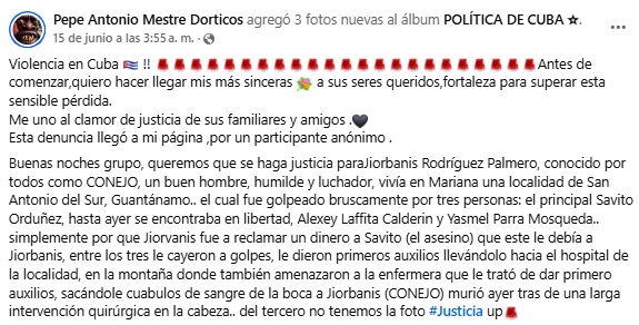 Cubanos acudieron a redes sociales para denunciar la muerte de Jiorbanis Rodríguez Palmero, un vecino de San Antonio del Sur que recibió una brutal golpiza de tres hombres debido a una deuda.