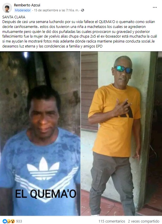 La denuncia, compartida en el grupo de Facebook “Accidentes y asesinatos por toda Cuba”, señala que el fallecido peleó a machetazos con otra persona, y aunque ambos resultaron lesionados en el incidente, “El Quema’o” fue quien se llevó la peor parte.