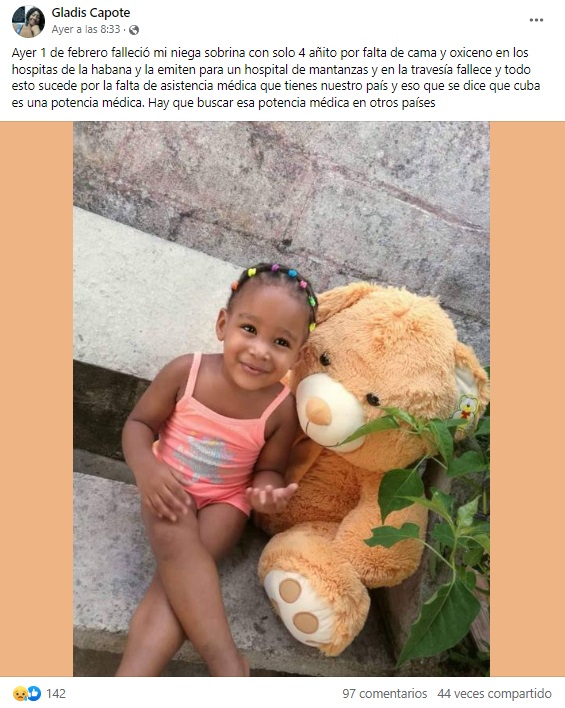 “Ayer, 1 de febrero, falleció mi nieta-sobrina con solo 4 añitos, por falta de cama y oxígeno en los hospitales de La Habana. La emitieron para un hospital de Matanzas, y en la travesía, falleció. Todo esto sucede por la falta de asistencia médica que tiene nuestro país, y eso que se dice que Cuba es una potencia médica. Hay que buscar esa potencia médica en otros países”, redactó la activista.