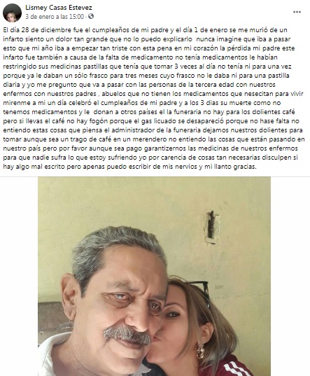 Posteriormente, Lismey Casas Estévez, presunta hija del anciano cubano fallecido en Camagüey denunció en Facebook todo lo que vivió en el hospital provincial en donde tampoco había los medicamentos que necesitaba su papá para poder sobrevivir.
