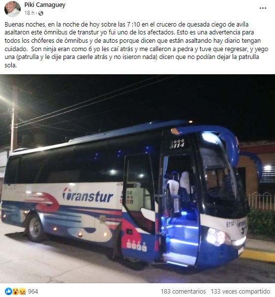Ciudadanos de la Isla denunciaron en redes sociales que un ómnibus fue asaltado la noche de este miércoles 1 de febrero en la provincia de Ciego de Ávila, otro ejemplo que deja en claro que la inseguridad dentro de la Isla ha aumentado de manera considerable.
