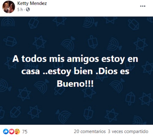 Sin embargo, hace pocas horas la propia Ketty escribió en su perfil de Facebook que ya se encontraba en su casa: “A todos mis amigos estoy en casa, estoy bien. Dios es bueno”.