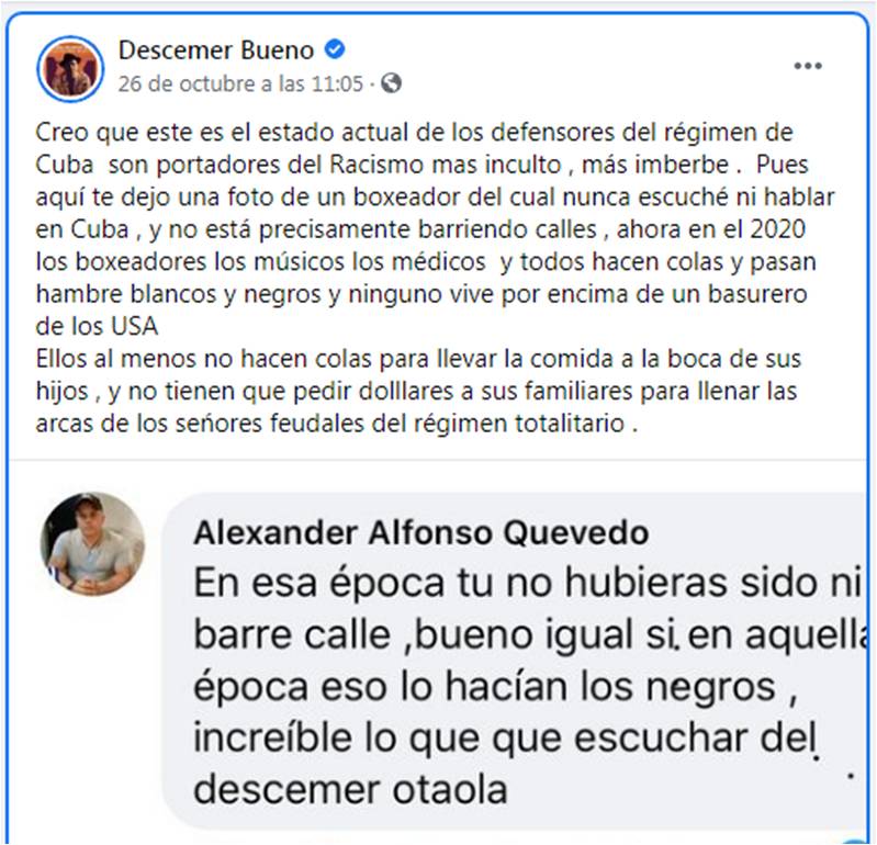 Por lo que Bueno reaccionó: “Creo que este es el estado actual de los defensores del régimen de Cuba: son portadores del racismo más inculto, más imberbe. Pues aquí te dejo una foto de un boxeador del cual nunca escuché ni hablar en Cuba, y no está precisamente barriendo calles, ahora en el 2020 los boxeadores, los músicos, los médicos y todos hacen colas y pasan hambre, blancos y negros, y ninguno vive por encima de un basurero de los USA”.
