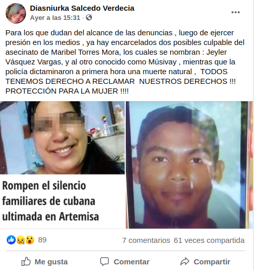 Dos sujetos sospechosos del asesinato de la cubana Maridel Torres Mora fueron detenidos en el municipio Alquízar de Artemisa, según informó la activista Diasniurka Salcedo Verdecia.