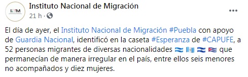 “El día de ayer, el Instituto Nacional de Migración en Puebla con apoyo de la Guardia Nacional, identificó en la caseta Esperanza de CAPUFE, a 52 personas migrantes de diversas nacionalidades hondureña, salvadoreña, guatemalteca y cubana, que permanecían de manera irregular en el país, entre ellos seis menores no acompañados y diez mujeres”.