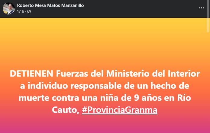 El periodista Roberto Mesa Matos informó en Facebook que el detenido está vinculado a un “hecho de muerte” contra la menor.