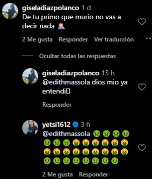 Sin embargo, la forma en que Massola se pronunció generó también varias críticas, pues al ser cuestionada por el usuario sobre si “diría algo” por la muerte de su primo, Edith rompió el silencio con un escueto comentario.