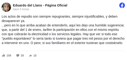Asimismo indicó que valdría la pena “ver si todo ese ‘pueblo espontáneo’ lo sería tanto si tuviera que pagar tres mil pesos por el derecho a intervenir en uno. O peor, si sus familiares en el exterior tuvieran que costeárselo”.