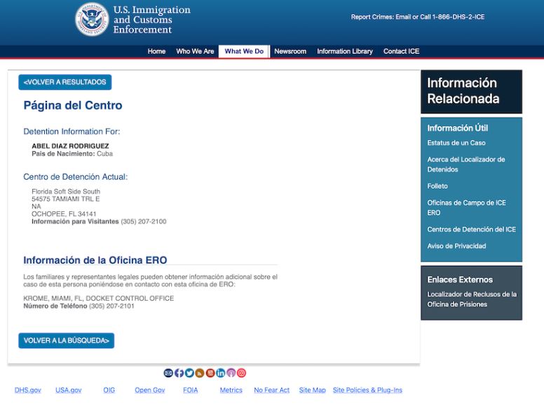 La ficha oficial indica que su caso está bajo la jurisdicción de la Oficina de Operaciones de Ejecución y Remoción (ERO), con sede en Miami, organismo encargado de ejecutar órdenes finales de expulsión del país.