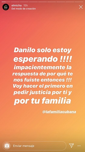 “Danilo, solo estoy esperando impacientemente la respuesta de porqué te nos fuiste. Entonces voy a ser el primero en pedir justicia para ti y tu familia”, escribió Michael Fernando Sierra Miranda, nombre real de El Micha, en una historia de Instagram.