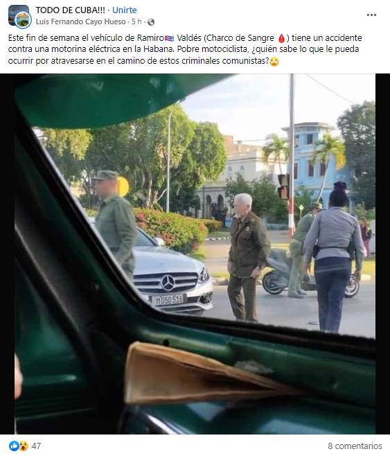 De acuerdo con varias páginas oficialistas de Facebook, el incidente ocurrió el pasado sábado alrededor de las 7:30 a.m., cuando presuntamente un motociclista ignoró las señales de alto marcadas por un agente de la Policía Nacional Revolucionaria (PNR) e impactó con el lujoso Mercedes-Benz de una de las personas más importantes en el régimen castrista.