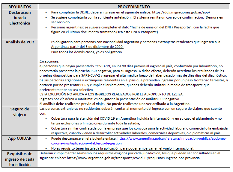 “Informamos que en el día de la fecha se ha publicado en el Boletín Oficial la Resolución Conjunta 11/2020 que establece nuevos requisitos de ingreso para la República Argentina.