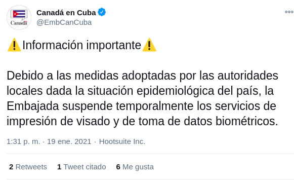 La Embajada de Canadá en Cuba ha informado a través de sus canales oficiales que, debido a las medidas sanitarias adoptadas por las autoridades, quedaban suspendidos los servicios de impresión de visado y toma de datos biométricos.