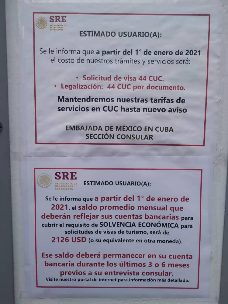 La información emitida por la Secretaria de Relaciones Exteriores mexicana indica que la solicitud de visa y la legalización de documentos se mantiene con un valor de 44 CUC. Al respecto, señalan que los precios se verán reflejados en CUC hasta nuevo aviso.