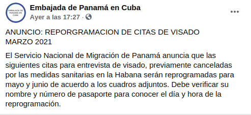 La Embajada de Panamá en Cuba informó a través de sus canales oficiales que las citas para otorgar visado, que fueron canceladas debido a la crisis epidemiológica, serán reprogramadas para los venideros meses de mayo y junio.