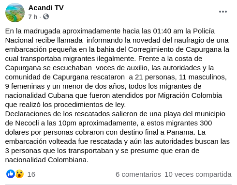 “En la madrugada aproximadamente hacia las 01:40 am la Policía Nacional recibe llamada informando la novedad del naufragio de una embarcación pequeña en la bahía del Corregimiento de Capurgana la cual transportaba migrantes ilegalmente”, escribió el canal Acandi TV en su cuenta de Facebook.