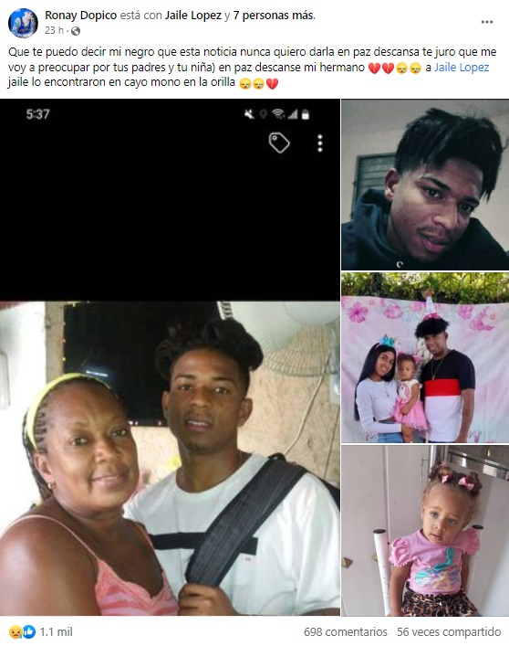“Qué te puedo decir, mi negro, que esta noticia nunca hubiera querido darla. En paz descansa. Te juro que me voy a preocupar por tus padres y tu niña. En paz descanse, mi hermano. A Jaile López lo encontraron en Cayo Mono, en la orilla”, se lee en una publicación compartida este miércoles en Facebook.