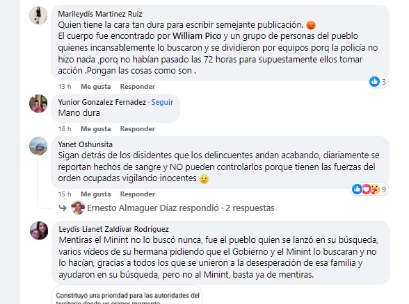 Sin embargo, los internautas desmintieron esto, recalcando que la policía estaba esperando a que pasaran las 72 horas reglamentarias que tienen que esperar antes de comenzar con la búsqueda. En ese sentido, aseguraron que fueron ciudadanos de Mayarí los que se dieron a la tarea de encontrar el cuerpo, por lo que consideraban indignante que ahora quisieran quedarse con el crédito.