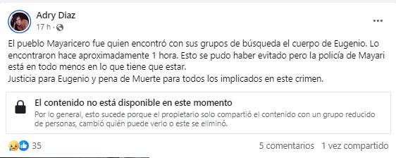 “El pueblo mayaricero fue quien encontró con sus grupos de búsqueda el cuerpo de Eugenio (…) Lo encontraron hace aproximadamente 1 hora. Esto se pudo haber evitado, pero la policía de Mayarí está en todo menos en lo que tiene que estar”, se lee en su denuncia.