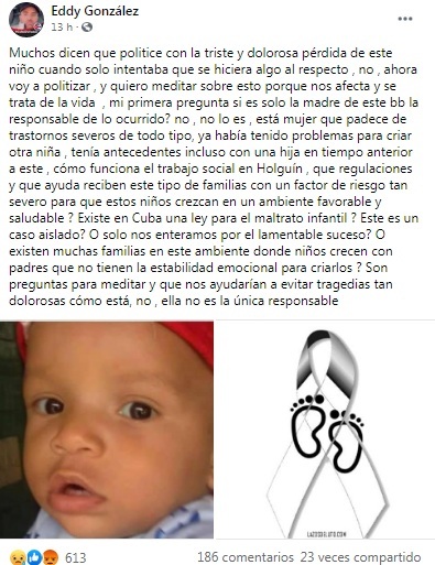 González continuó con interrogantes en sus mensajes en las redes sociales, en esta oportunidad preguntándose si en Cuba existen leyes en contra del maltrato infantil que permitan evitar tragedias como la ocurrida, al tiempo que invito a reflexionar sobre este caso.