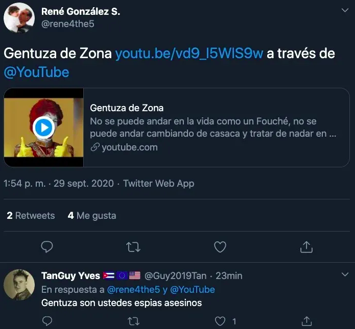 De ahí que, el ex espía cubano René González se uniera a la campaña para desacreditar al dúo cubano llamándolos “gentuza de zona” al compartir desde su cuenta de Twitter un video de YouTube que recopila varias declaraciones de los músicos cubanos, así como el momento en que saludaron a Díaz-Canel y lo reconocieron como presidente de Cuba en un concierto que ofrecieron en La Habana.