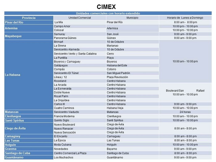 En La Habana 18 tiendas Cimex ampliarán sus horarios: la unidad comercial Brimart, (Diez de Octubre), La Sirena (Marianao), Servicentro Alameda (Diez de Octubre), Servicentro Vento y Santacatalina (Cerro), La Puntilla (Playa), Boyeros y Camagüey (Boyeros), Galápagos (Habana del Este), Compás (Cotorro), Servicentro El Túnel (San Miguel del Padrón), Línea y 12 (Plaza de la Revolución), Roseland (Centro Habana), La Arcada (Centro Habana), La Esmeralda (Centro Habana), Doble Nueve (Centro Habana), Royal Palm (Centro Habana), La Orquídea (Centro Habana), Carlos III (Centro Habana) y la unidad comercial Cuatro Caminos en la Habana Vieja.