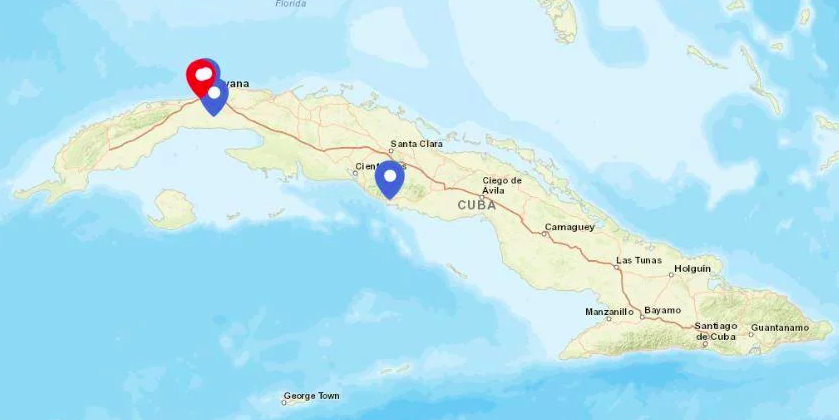 La ciudad de Trinidad esta marcada en azul debido a que siete residente locales fueron puestos en aislamiento porque tuvieron contacto con dichos turistas y se tomó la medida de tenerlos bajo vigilancia clínica para confirmar si están o no contagiados.